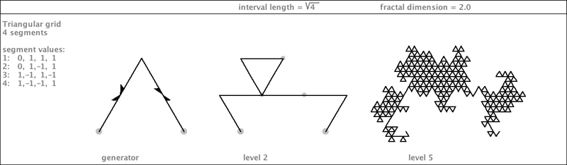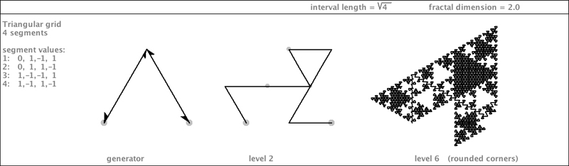 | Since root4 = 2, and since square grids and triangle grids share common grid points along an axis (the horizontal "floor" of the two grids), you may suspect that there exists a family of root4 plane-filling curves that live in the triangle grid. Indeed I have discovered what I believe to be all of them. |