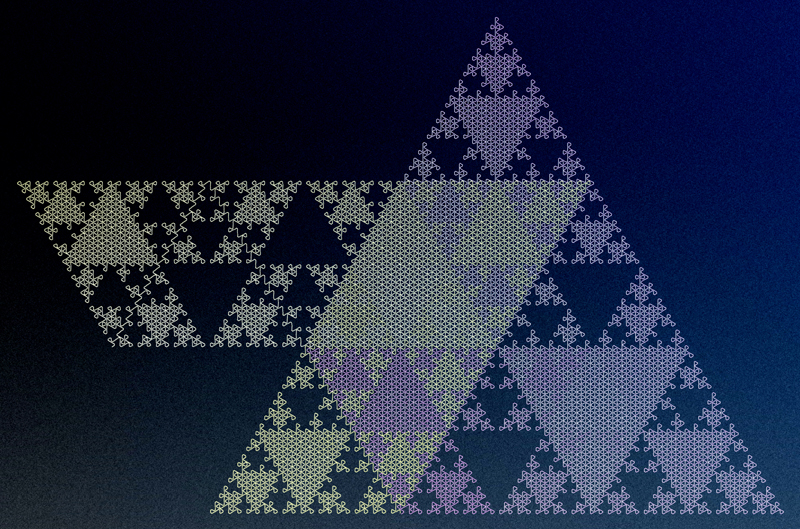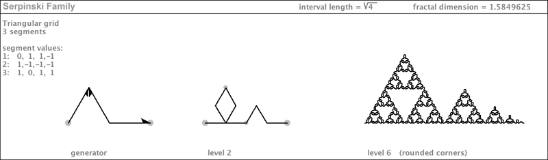 | But before I show you these plane-filling curves, I would first like to show you a member of the root4 triangle grid family that is not plane-filling: its fractal dimension is ~1.5849625, and it generates the famous Sierpinski Arrowhead Curve. It is identical to the Sierpinski Triangle (a solid triangle with its center triangle cut out, and then with the center triangles cut out of the remaining three, and so on)... |