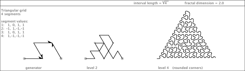 | The last members of the root4 triangle grid family I will show you are curves that exactly fill an equilateral triangle. They are pseudo-gridfillers. |