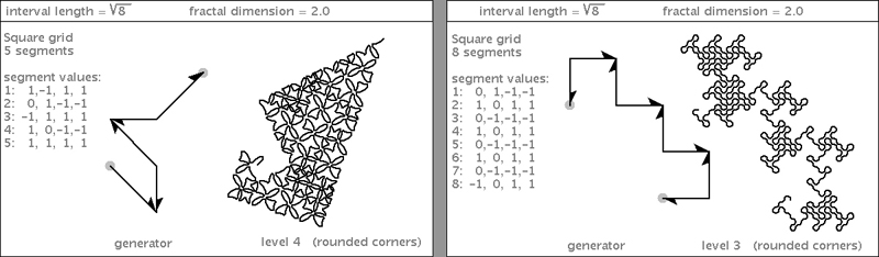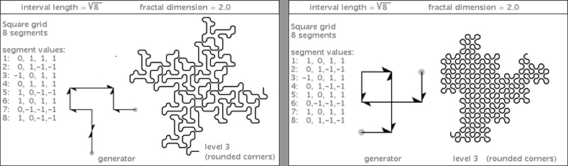 As a general rule, you can consider segments of length root2 to count as two (remember that we square the lengths when calculating fractal dimension). So in this case, two one-length segments and three segments of root2 - when squared - add up to 8: the family number. The root8 family is quite versatile. First let's look at some curves that fill a right triangle. Two of them are shown below. Like the last curve I showed you, the generators for these curves each have 5 segments, three with a length of root2. |