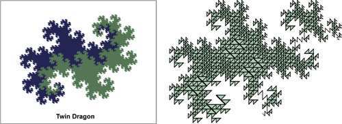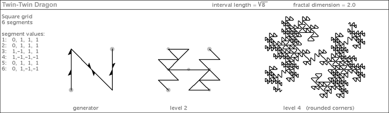 | This next curve fractalizes into a pair of Twin-Dragon-like curves. Because of the similarity to the shape as the Twin Dragon, I call it the "Twin-Twin Dragon". Are the two twins holding hands? No; their babies are holding baby hands. |