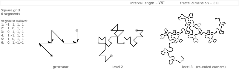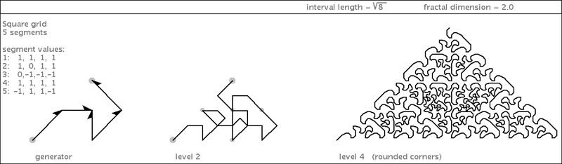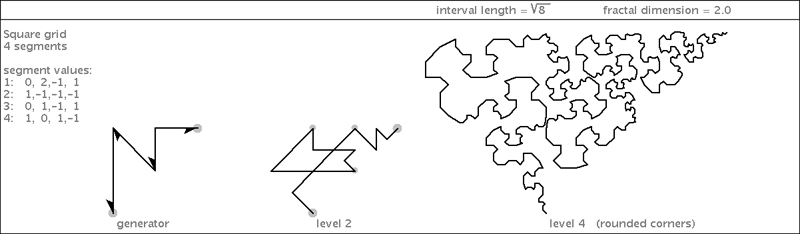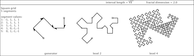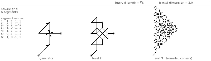 When I showed this curve to you before, it was rotated 45 degrees. Here is it shown in its native familial orientation. Notice that the generator has only 5 segments, and that three of those segments have a length of root2. These segments are responsible for the three large lobes in the 2nd teragon.