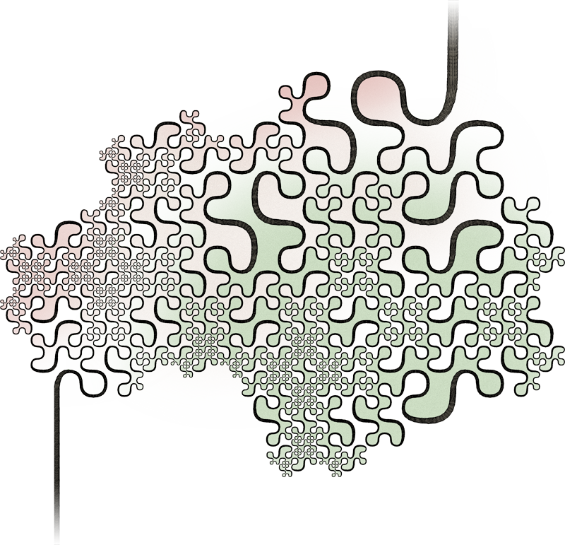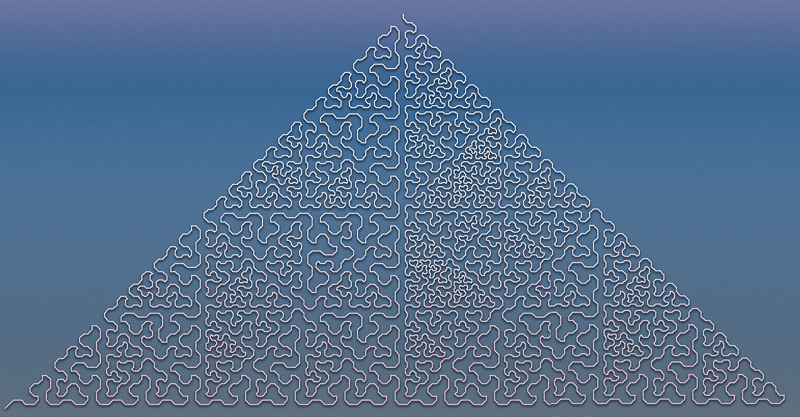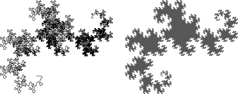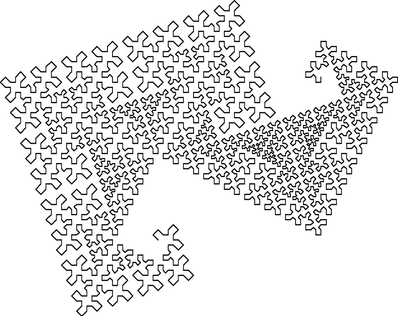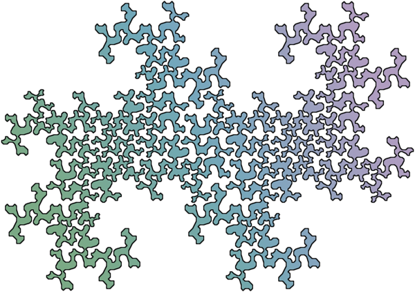 | I am impressed with how this curve is so unpredictable and irregular in its internal meandering, yet it is able to avoid any self-crossings (it does self-touch on vertices: those are separated due to the rounded-corners scheme of the drawing). Here is a rendering of two copies of this curve (one flipped 180 degrees). They are combined to make the shape of the twin dragon - which closes the loop, enabling it to be filled internally with color. |