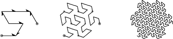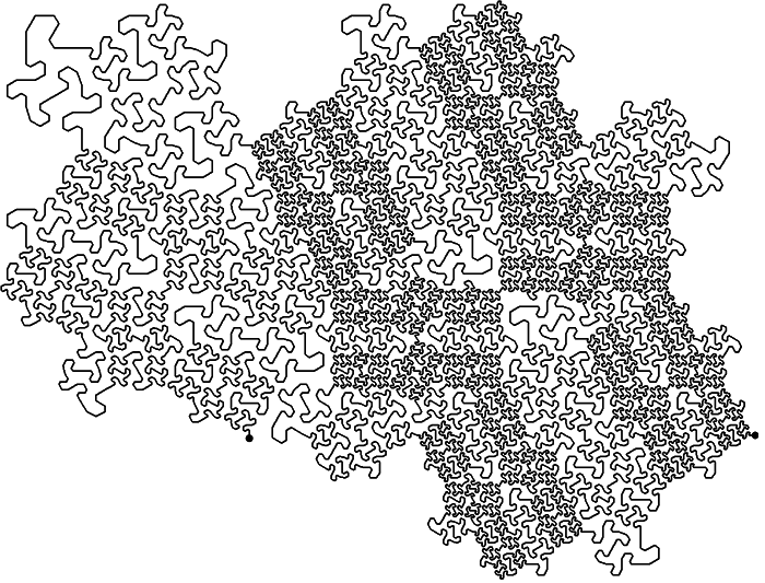 Now is a good time to give a more formal, more general definition: a "space-filling curve" can be described as a continuous mapping from a lower-dimensional space into a higher-dimensional space. In traditional mathematics, a curve is described as a topological space that is homeomorphic to a line: if you magnify a small region of the curve, it looks like a straight line. The higher the magnification, the more it looks like a straight line. But...fractals came along and changed all that! Consider a curvy line that has an infinite number of curls, bends and folds...at every level of magnification. And consider a curve that has such a serious case of horror vacui that it visits every point in a planar area in its path from start to finish. This is what we mean by a "plane-filling curve". It is the topological equivalent to a planar shape covering that same region. So you can think of this curve as being a particular way to describe that planar shape. In other words, it provides a mapping between a line and a 2D shape. Mandelbrot used the term "sweep" to distinguish a plane-filling curve from any old 2D planar shape, implying the progression of a path that passes through every point in that shape over some period of time. (A more thorough overview of space-filling curves is given by Hans Sagan [20]). |
