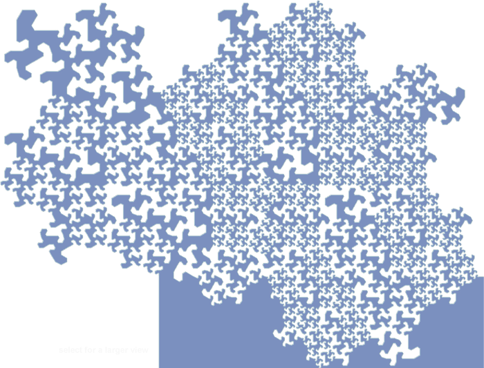 A fractal curve that doesn't cross itself can be described as the boundary between two highly-intertwined domains. Like sea and land, or like lungs and air, these boundaries can be highly convoluted. Let's take the fractal curve from the previous page, and fill it up with light-blue water, to see what happens... |