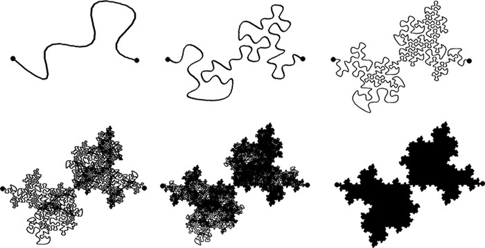 So instead let's imagine that we keep the endpoints the same distance from each other, and that the string gets longer and longer, adding more and more bays and peninsulas to fill up space. This is illustrated below. I use the term "fractalize" to describe this process. It turns out that there are many ways that a curve can be fractalized as it gets longer. And we can capture some of these ways in simple, elegant geometrical processes.