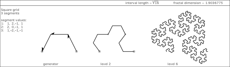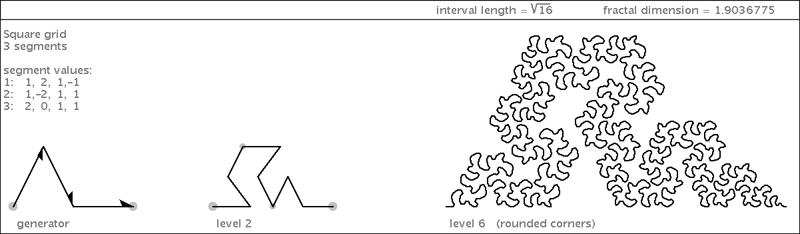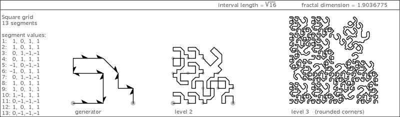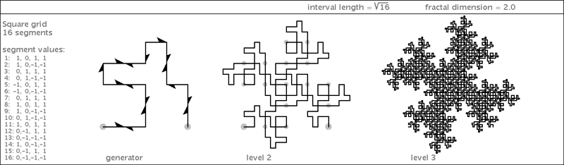| One way to express a square number S is to draw a square made up of S smaller squares. I've shown you fractal curves of the root4 and root9 families where square regions are filled. Now we come to the next square number: 16. Below is a curve of dimension 2 that is a partial gridfiller, and it is also partially edge self-touching. On the next page are two specimens with dimension < 2 that are "trying" to fill a square, and a 2D specimen with 4-fold symmetry. |