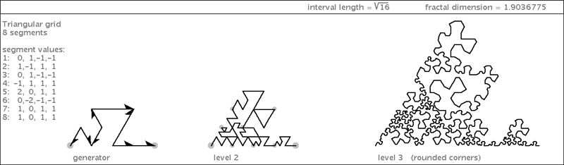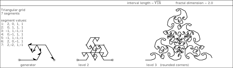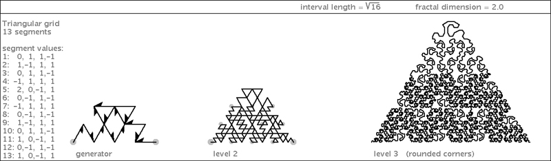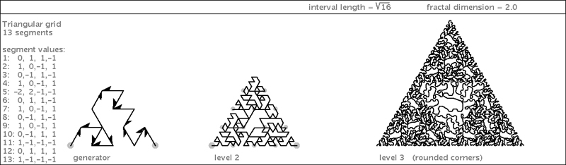 | Like the root16 square grid family, the root16 triangle grid family has many spacefilling curves that pertile equilateral polygons - in this case, triangles. I would like to show you a few. None of these examples are self-avoiders...but when rendered with rounded corners, they reveal some unique characteristics. The next four specimens each have a segment of length 2 that lies horizontally across the middle of the 4x4 triangle that houses the generator. This horizontal segment is responsible for extending the curve upward towards the pinnacle - increasingly with each fractal level. |