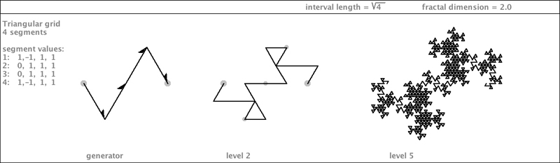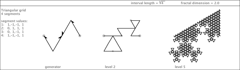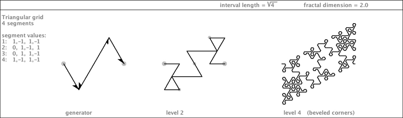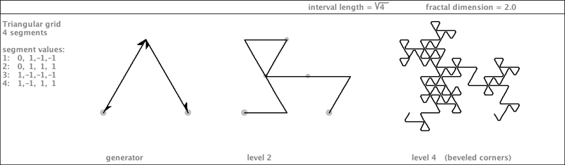 Since root4 = 2, and since square grids and triangle grids share common grid points along an axis (the horizontal "floor" of the two grids), you may suspect that there exists a family of root4 plane-filling curves that live in the triangle grid. Indeed I have discovered what I believe to be all of them. |