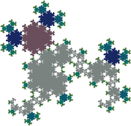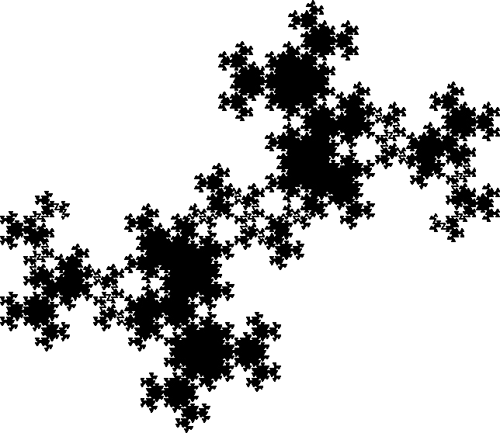 This fractal curve is a gridfiller, but it has a wild boundary, which has a high fractal dimension of its own. Not only that: the boundary touches itself. This fractal makes the notion of "plane-filling" very fuzzy (so to speak) because the region of the plane that it fills is scattered haphazardly. All the filled-in areas of fully fractalized curves that we have seen before this one had boundaries that were either straight lines or else they were fractal curves of their own...but never self-touching. Now get ready; here is that same generator with some different flippings. Its boundary is so amazingly self-touching, you might call it "self-enveloping" (but it is NOT self-crossing, as revealed by rendering it with rounded corners). |