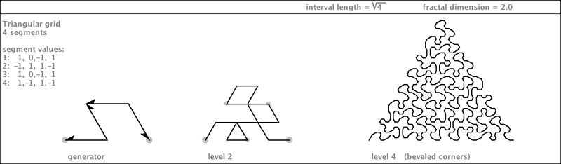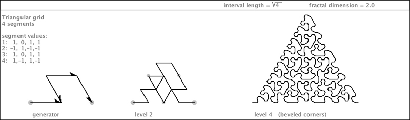 The last members of the root4 triangle grid family I will show you are curves that exactly fill an equilateral triangle. They are pseudo-gridfillers. |