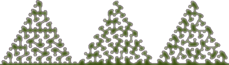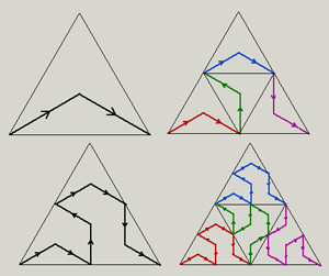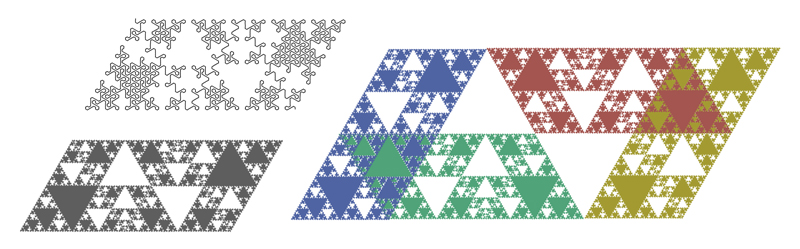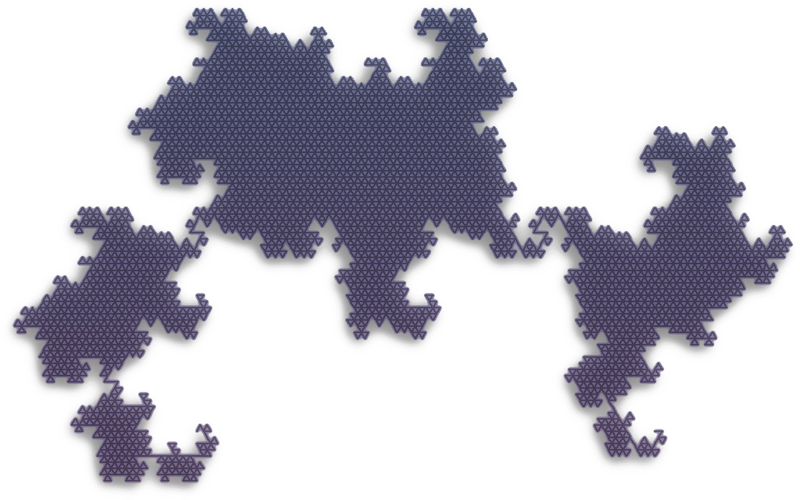 But before I show you these plane-filling curves, I would first like to show you a member of the root4 triangle grid family that is not plane-filling: its fractal dimension is ~1.5849625, and it generates the famous Sierpinski Arrowhead Curve. It is identical to the Sierpinski Triangle (a solid triangle with its center triangle cut out, and then with the center triangles cut out of the remaining three, and so on)... |