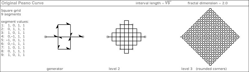 | Now let's add a floor and a basement to this generator and see what happens. Lo and behold, we get one of the most familiar - and oldest - plane-filling curves of all time: the "Original Peano Curve" (as Mandelbrot called it: Giuseppe Peano explored many variations). Rounded corners help a lot when viewing this curve. |