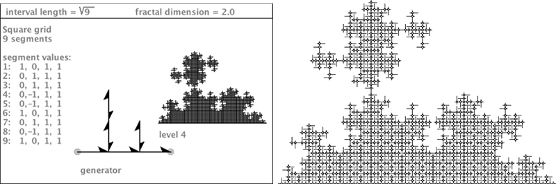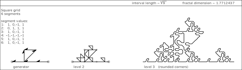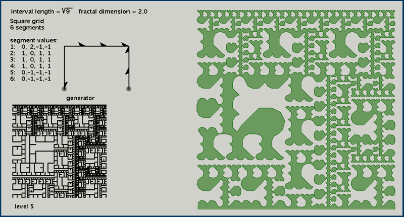 | The sepcimen below has a generator with a 2-length segment corresponding to a 2x2 square (shown in purple at right). It has a lot of self-touching edges, and so I used the low-pass smoothing filter to render level 5 with filled-in areas to show the interesting self-similarity. |
