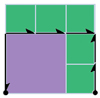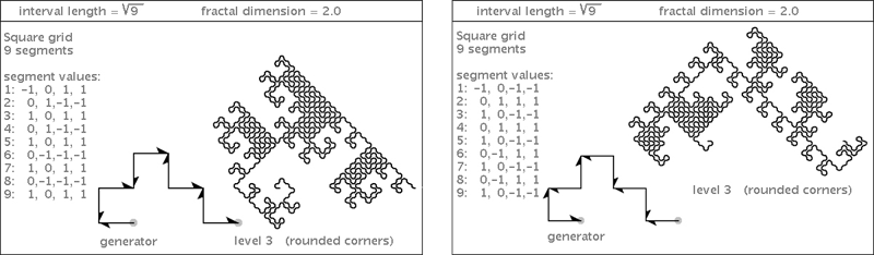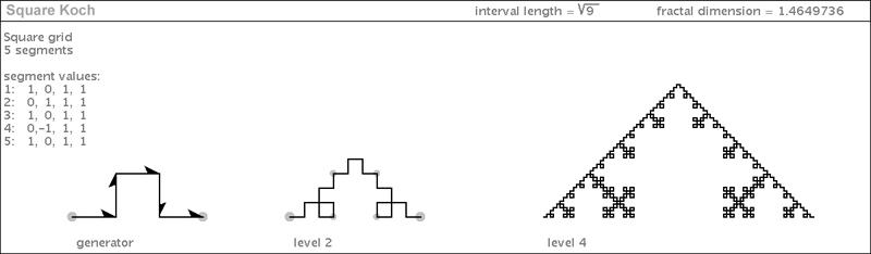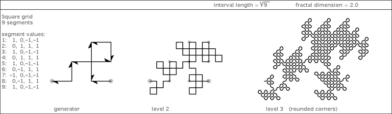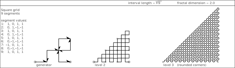 | The root9 square grid family has many interesting plane-filling curves. The square root of 9 is of course 3. And, being an integer, my scheme places the interval length horizontal, stretching across three grid cells. We already encountered one member of this family early on when I showed you the Koch curve: its friend, the Square Koch. Here is its diagram: |