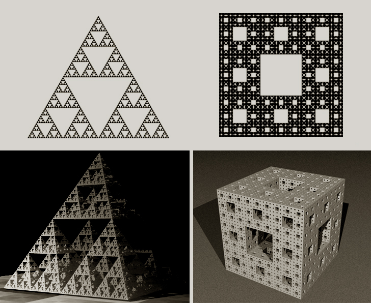 | The Holey Castle is related to a large class of fractals that are riddled with holes, such as the Sierpinski Triangle and the Sierpinski Carpet (and their 3D counterparts: the Tetrix and the Menger Sponge): |