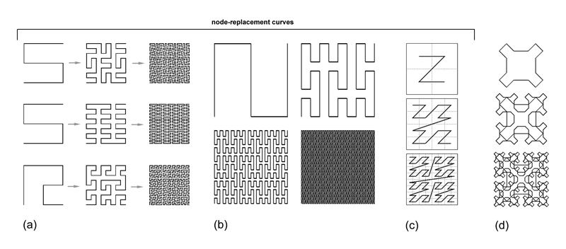 | Node-replacement curves are generated by replacing tiles with smaller copies of the generator, while edge-replacement curves are generated by replacing the segments of a generator with smaller copies of the generator. One important consequence of node-replacement is that it requires connective segments to be added at each stage, to keep the curve unbroken, as we just saw above. Some examples of similar curves are shown below: a curve attributed to Walter Wunderlich (a); a curve attributed to Peano (b); and the Z-Order (Lebesgue) Curve (c). The Sierpinski Curve (d) is shown here because it is similar, however it is of a different class: it uses a different kind of connectivity at each stage. |