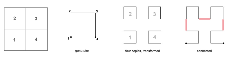 One of the most well-studied techniques for generating plane-filling curves is a process that is similar to Koch construction, except that it is based on node replacement instead of edge replacement. This technique has been explored by mathematicians and hobbyists for centuries. Peano, Hilbert, Moore, and Wunderlich, are among the mathematicians who have described such curves. Below is an example of using this technique to generate a well-known curve with a generator of four nodes: the Hilbert Curve [9]. It is based on the fact that a square can be tiled with four smaller squares. Take a look at how this simple generator is copied four times, transformed, and connected to form the shape at right: |