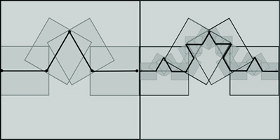 | The above curves fractalizes to the same shape as a well-known fractal curve introduced by Mandelbrot (at right). I'll be describing this curve later on. |