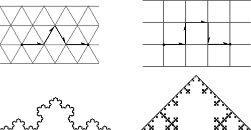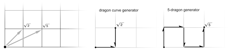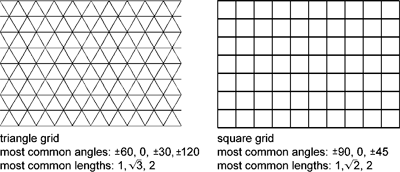 All plane-filling fractal curves in my scheme fit into one of two kinds of grids: triangle or square. The distance between grid points is exactly 1, in either case. The most common fractal curve angles and lengths in these specimens are shown at right, associated with each grid. |