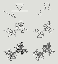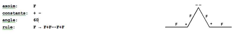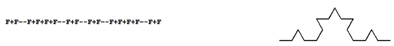 In 1968, a botanist by the name of Astrid Lindenmayer devised a way of describing the growth of plants. This has come to be known as "L-systems". They are recursive "string-rewriting systems", used to model branching forms, embryological development, and many self-similar fractal geometries. Consider the following L-system description used to draw the Koch curve: |