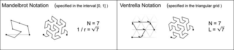 This grid-view of fractal generators comprises the basis for how I categorize all plane-filling fractal curves. In The Fractal Geometry of Nature, Mandelbrot specifies all fractal generators as existing within a horizontal interval of one unit. The illustration below uses the Gosper curve as an example of how my notation scheme is slightly different than the one Mandelbrot used. Instead of specifying the generator within the unit interval such that its endpoints lie on a horizontal line, I place it within a grid, and orient it so that its second endpoint lies on the grid location associated with its family type. This causes its interval length L to traverse a portion of the grid. My notation makes it visually more apparent that the Gosper curve is a member of the root7 family type. |