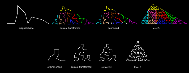 Fractals of this type are beautiful, complex, and amazing. But they do not easily lend themselves to learning the basic geometry of fractals, as a form of visual construction. This is why I am so enamored with self-similar fractal curves - as tools to think with; as visual objects to apply various geometrical ideas and processes from other domains. The process by which they are constructed can be explained to non-mathematicians. And if you are curious enough, and especially if you are willing to do a little bit of programming, it can lead to discovery upon discovery. The fractal generation technique that I use in this book is a variation of "Koch construction". It is based on the idea of taking a figure consisting of connected segments, and recursively replacing each segment with a copy of the whole figure. This is how the Koch curve is generated, and it is also how an infinite number of other possible fractal curves can be generated. Now, before I go on, I want to describe a few of the methods that have things in common with Koch construction. In some cases, these might be considered variations, or different approaches, to Koch construction. They are: * Node-replacement curves * Iterated function systems (IFS) * Branching Fractal Trees * L-Systems |