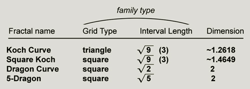 Now we have a consistent scheme for finding plane-filling fractal curves. The four fractals that I have just showed you are listed in the table below, along with their associated grid type and interval length (which I call "family type"). This table represents four different family types. |