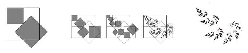 | Here is another picture that illustrates this process. In this picture, the original geometry consists of two gray squares, shown at left with a larger outlined square for reference. Each gray square is replaced with the original geometry, using the same relation that the gray squares have with the larger outlined square. |