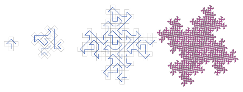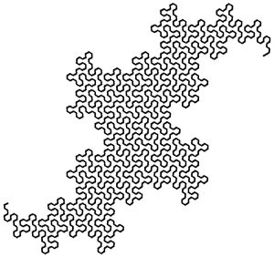 Here's how we calculate the fractal dimension of a curve: we take the number of segments in the generator (call it N), and then we take the interval length of the generator (call it L). Then we calculate the fractal dimension using this equation: In the case of the Koch curve, N=4, and L=3, and so the fractal dimension comes out to approximately 1.2618. For the square Koch, N=5, and L=3, and it's fractal dimension is approximately 1.4649. If the dimension of a fractal curve is 2 - and if it is well-behaved - it is a plane-filling curve. Families of fractal curves are determined according to how their generators fit within their grids, and what kinds of grids they occupy. Not all fractal generators are as simple as Koch and its square friend. And not all fractal generators rest horizontally on the grid. I'll give you two examples. |