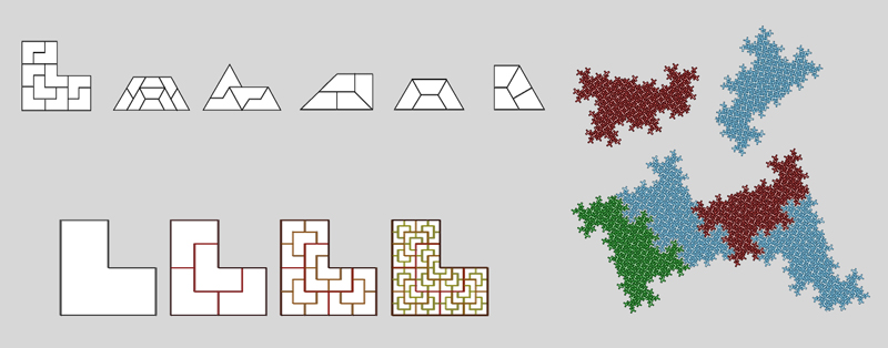 Since a fractal curve is made of smaller copies of itself, it logically follows that a plane-filling fractal curve is a filled-in shape that is made of smaller filled-in shapes - identical to itself. This means that plane-filling fractal curves are tiling. Not only are they tiling, but they are recursively tiling. Mandelbrot called this "pertiling" (using the prefix "per" as in perfume: to thoroughly fill with fumes). These tiles are also examples of "rep-tiles". A rep-tile is a plane figure that tiles the plane and can be divided into several smaller copies of itself. Some examples are shown below at left. At right are pertilings (fractal rep-tiles) of a specimen I will show you later. |