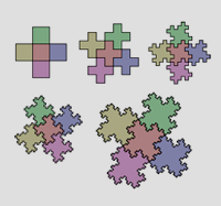 | When I put two related fractal specimens together like puzzle pieces, I like to use the term pertiling - especially if they have wild fractal boundaries. Sometimes I refer to this as "mating". Why? Because only specimens of similar species can fit together. You'll see as we meet the different families of plane-filling curves that each family has its own particular type of morphology. Below are two related specimens mating. The ends of their curves touch at the bottom of the image. |