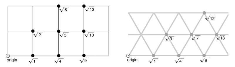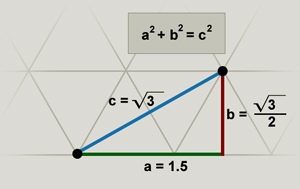 It is easy to use the Pythagorean theorem to figure out the grid point distances from the origin in the square grid, but the triangle grid is a bit more tricky. That is because the right triangle used to calculate a2 + b2 = c2 has lengths that are not integers. |