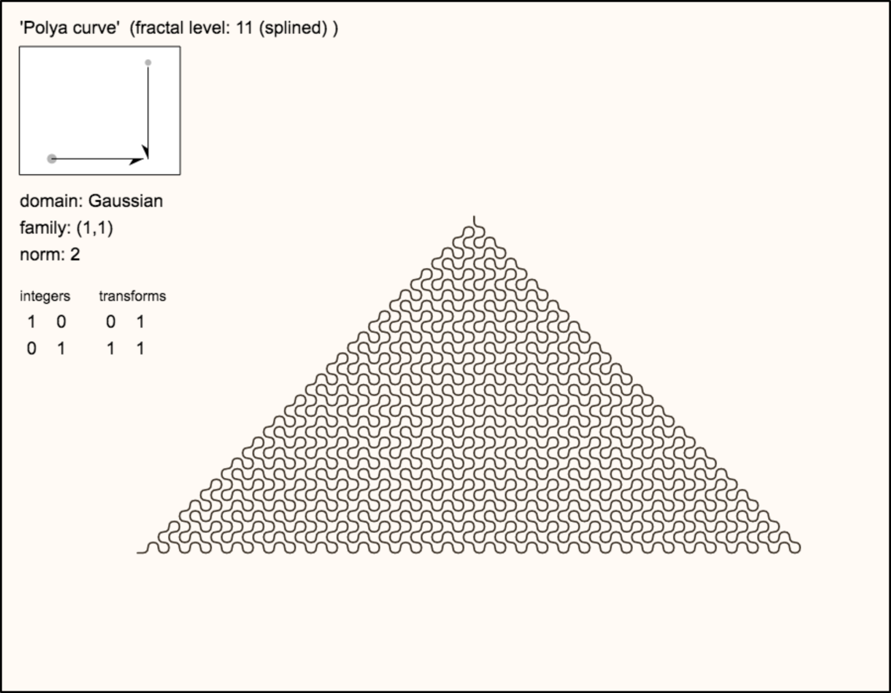 There are only two plane-filling curves in this family. They are both based on a common generator shape (two unit segments joined at a right angle), but the segments have different transforms. This family corresponds to a Gaussian integer with norm 2. Since it is a prime, all segments have length 1. The resulting contrast in phenotypes (a complex dragon vs. a right triangle) is a common occurance in several families.